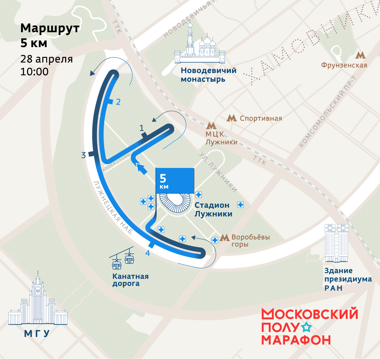Как добраться до старта:Стартово-финишный городок полумарафона расположен на территории Олимпийского комплекса «Лужники».